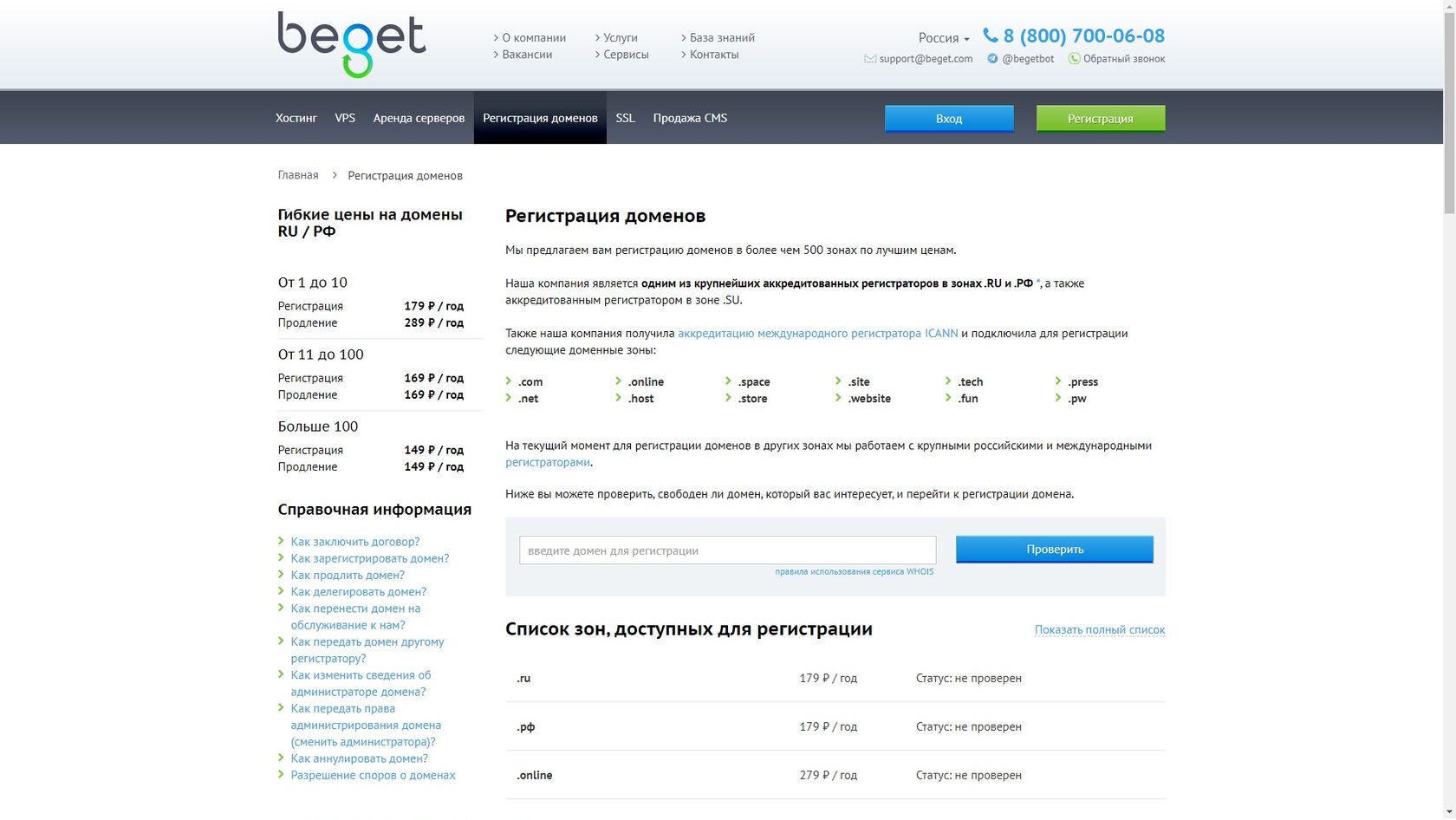 Также Вы можете зарегистрировать доменное имя через меню главной страницы сайта.