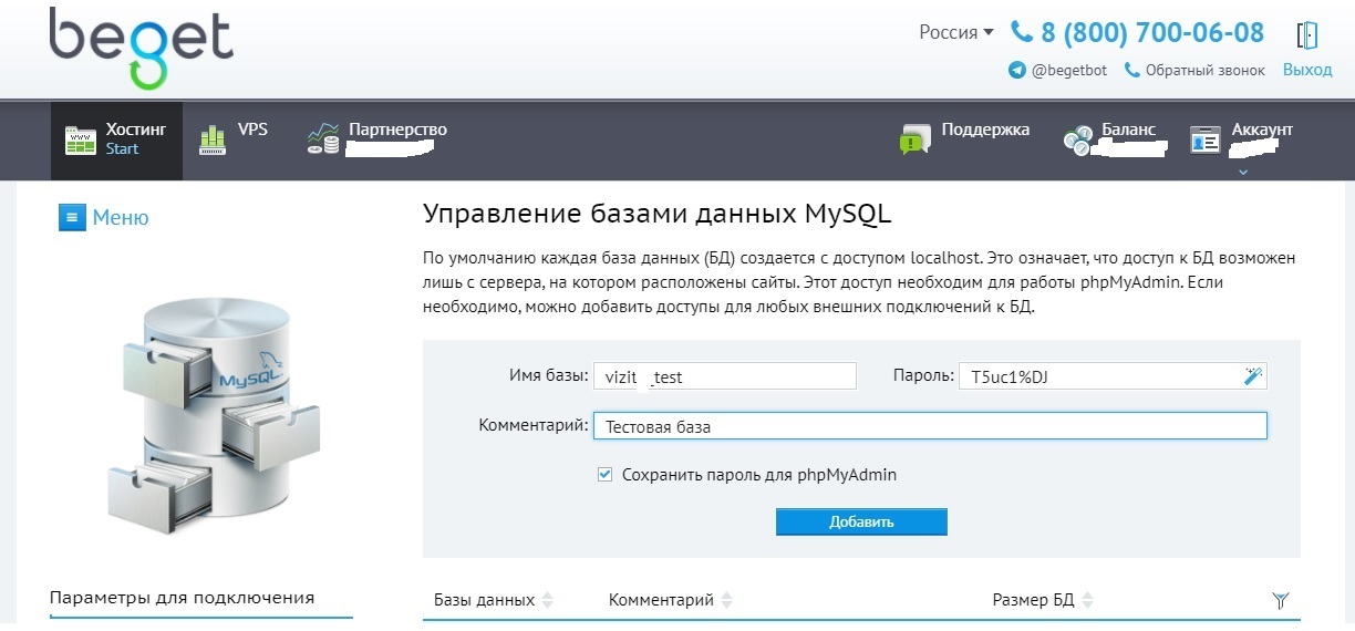На странице управления базами данных потребуется заполнить поле "Имя", придумать пароль и оставить комментарий (например, чтобы вспомнить куда эта база данных относится).